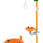 Application: Combination eyewash and shower safety station. Eyewash features a stainless steel bowl with two GS-Plus™ spray-type outlet heads that deliver a flood of water for rinsing eyes.