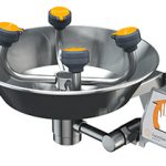 Application: Free standing, pedestal mounted WideArea™ eye/face wash. Four GS-Plus™ spray-type outlet heads deliver a flood of water over a wide area of coverage for complete rinsing of eyes and face.